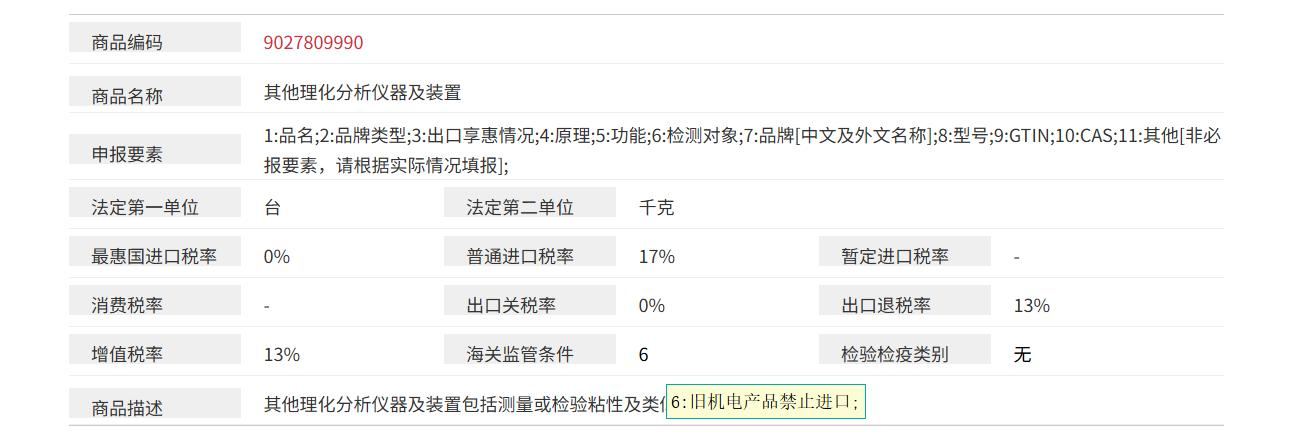 其中熱常數(shù)分析儀的海關(guān)稅則號為 9027809990,它的海關(guān)監(jiān)管條件為 6,即舊機(jī)電產(chǎn)品禁止進(jìn)口